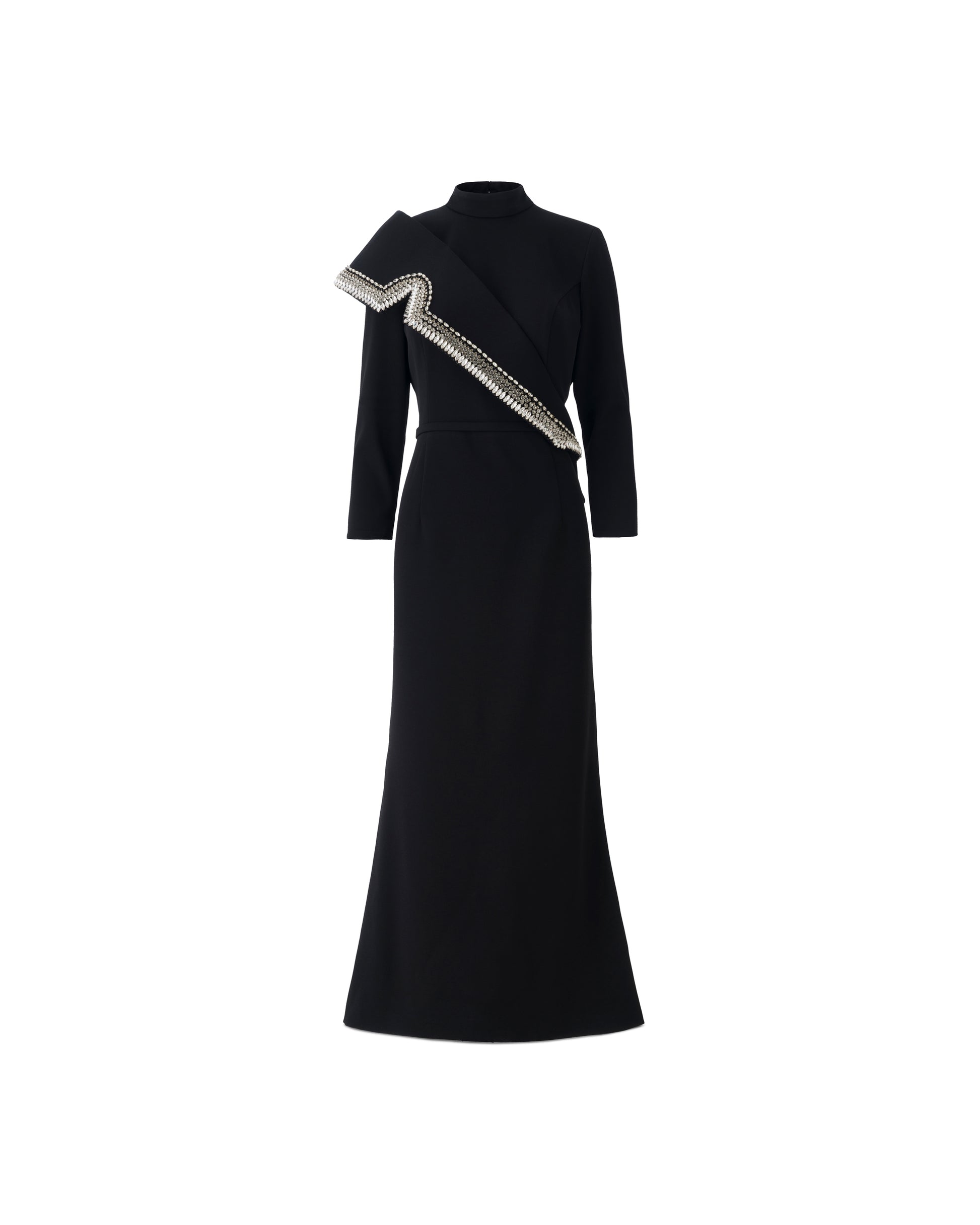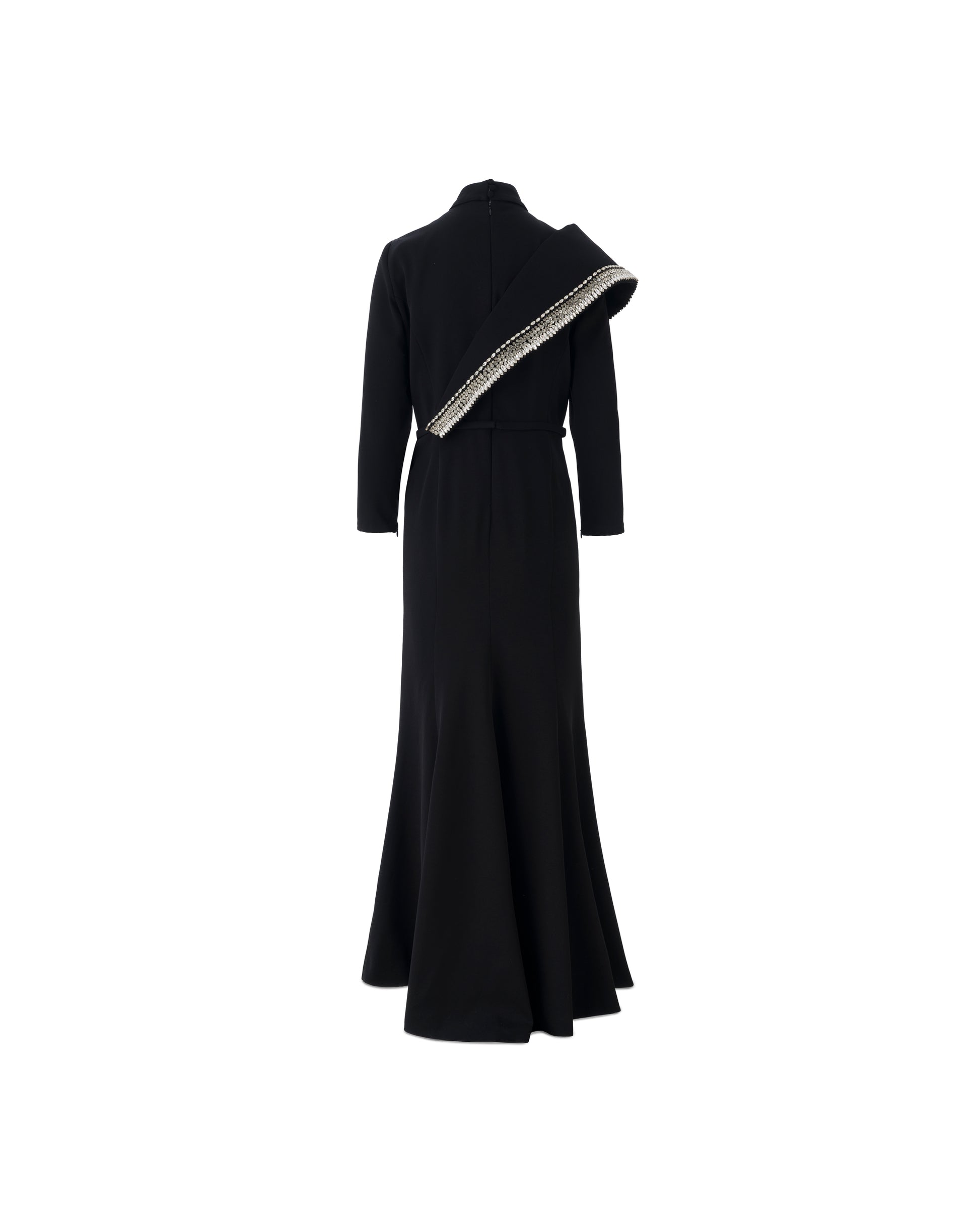 Asimetrik Yaka Detaylı İşlemeli Uzun Kollu Özel Dikim Hakim Yaka Gece Elbisesi