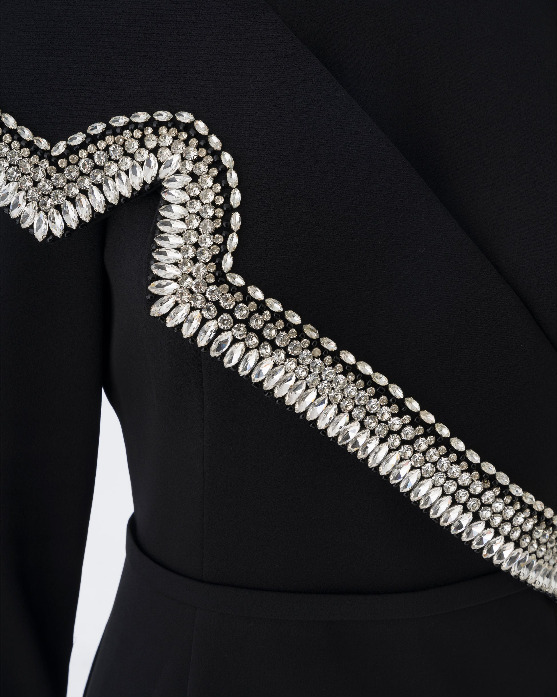 Hakim Yaka, uzun kollu, fermuarlı, asimetrik ceket elbise görünümlü, el işlemeleri, özel tasarım gece elbisesi.