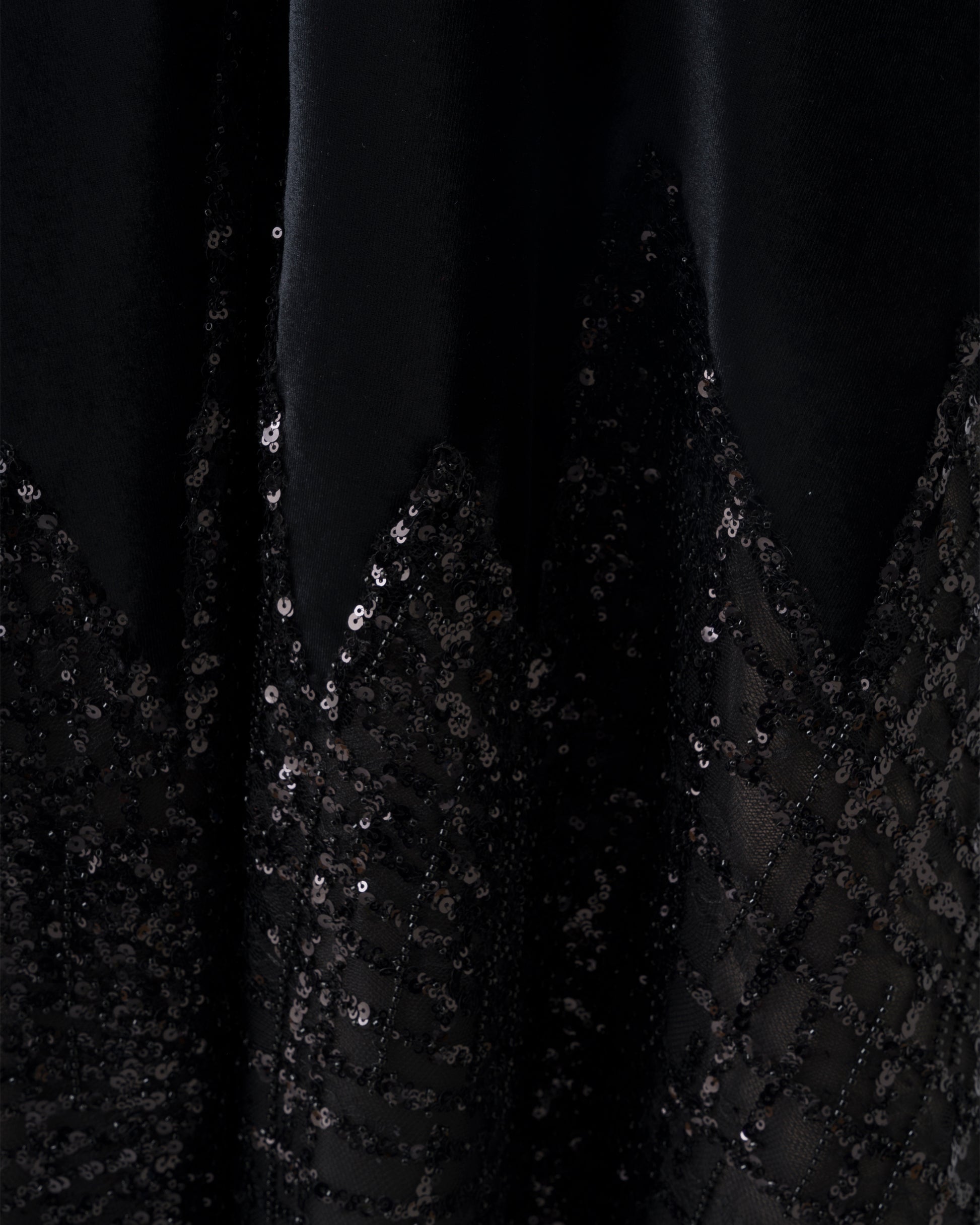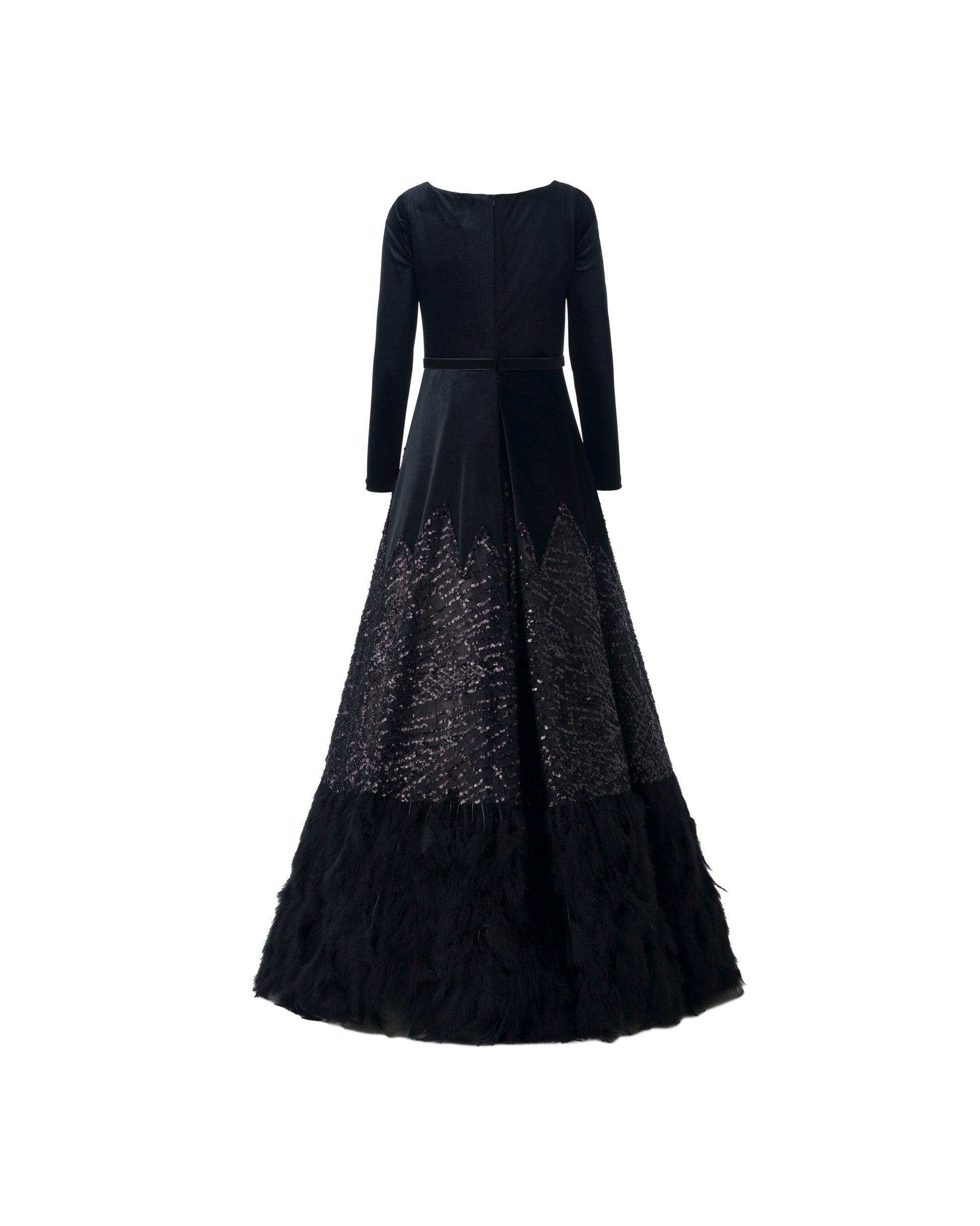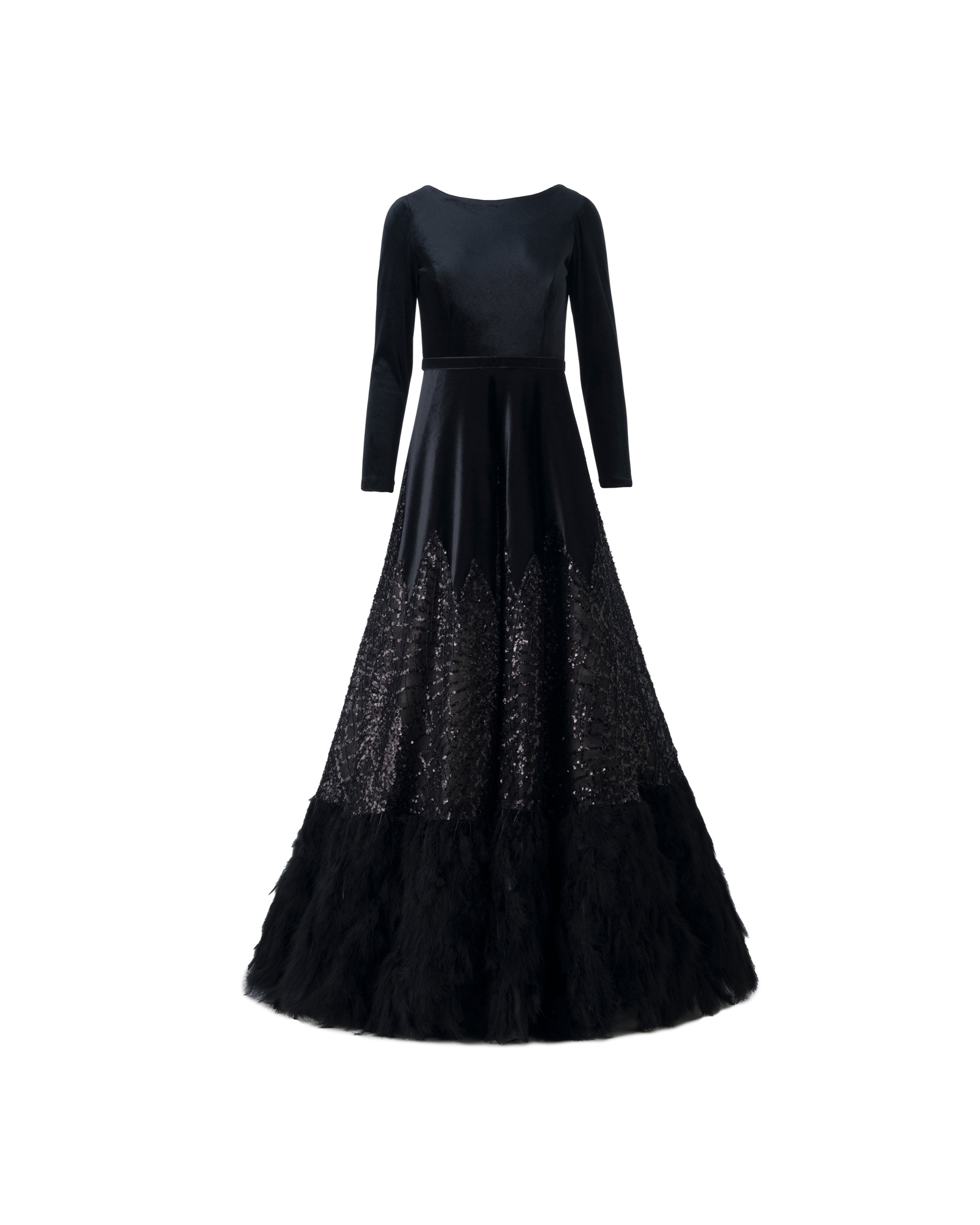 Uzun kollu, kadife, el yapımı işleme ve payet desen karışımı, otriş detaylı, fermuarlı, tamamı astarlı, özel tasarım gece elbisesi.