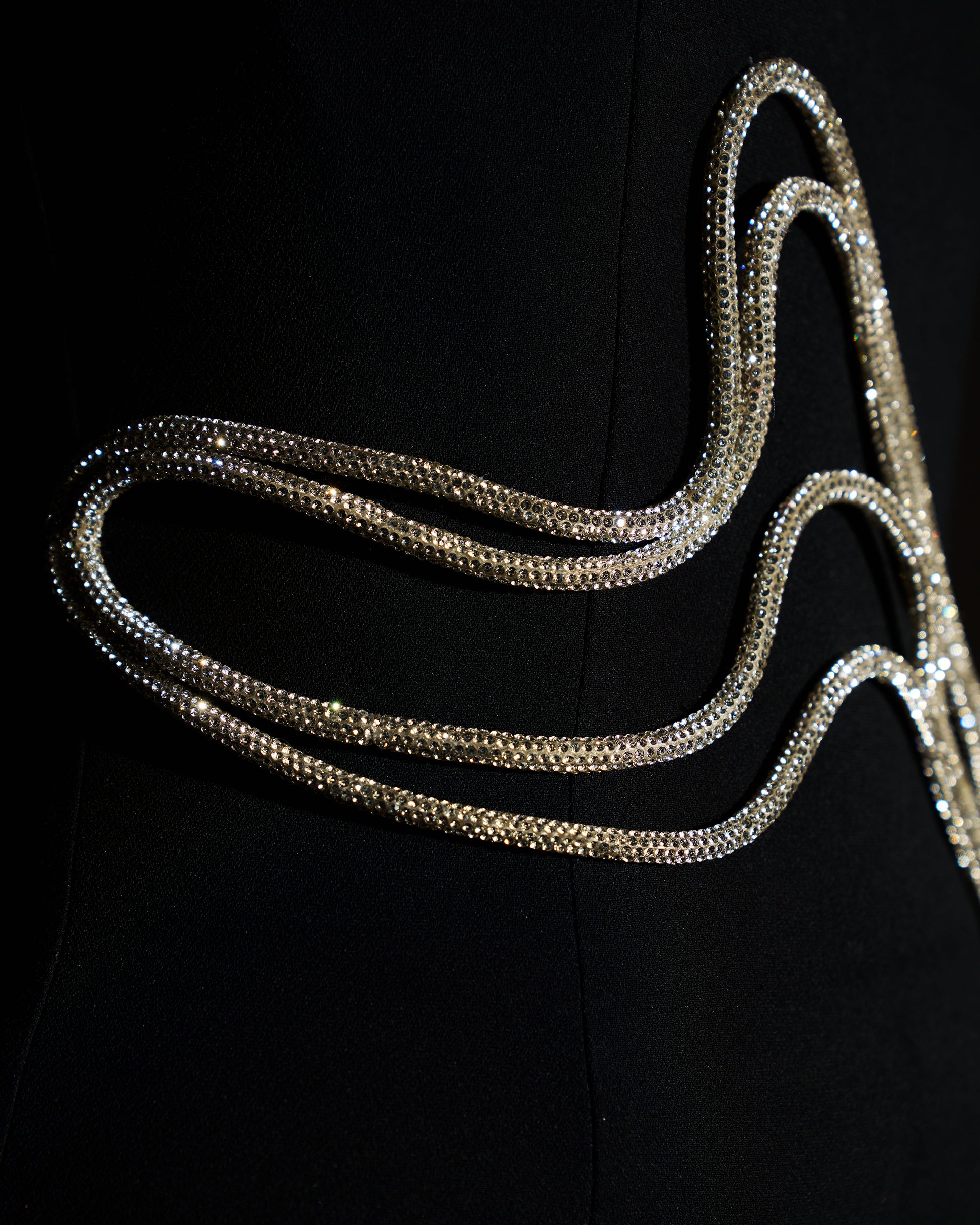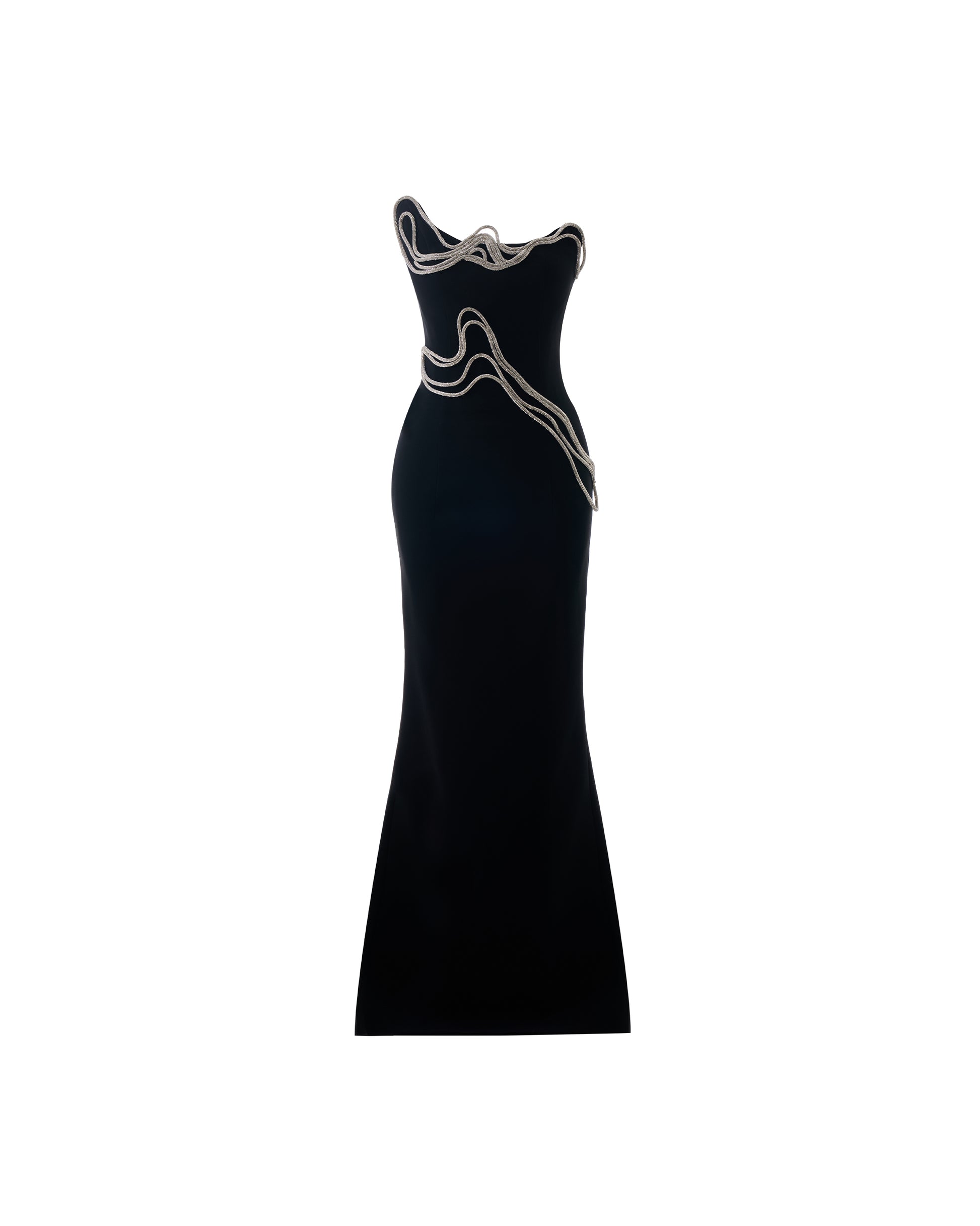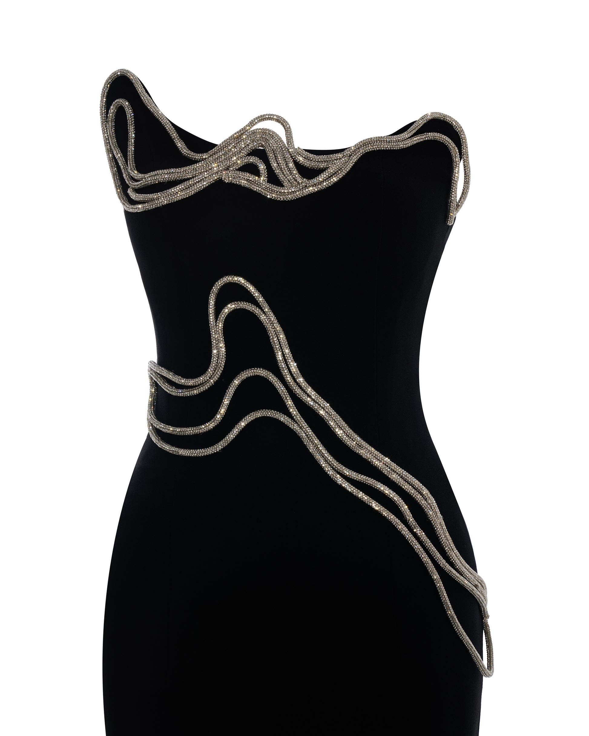 Gümüş Halat Detaylı Siyah Gece Elbisesi
