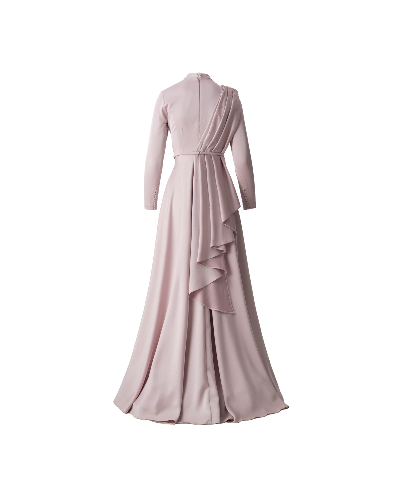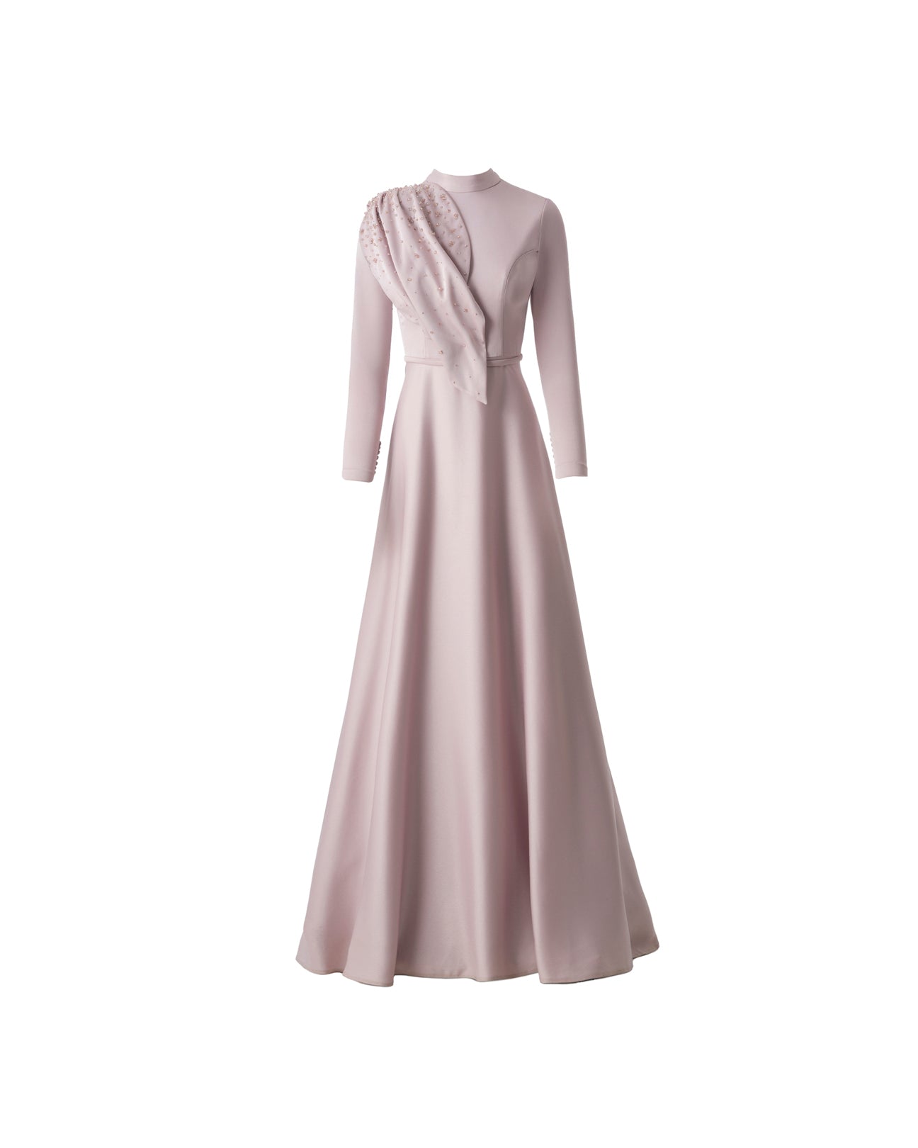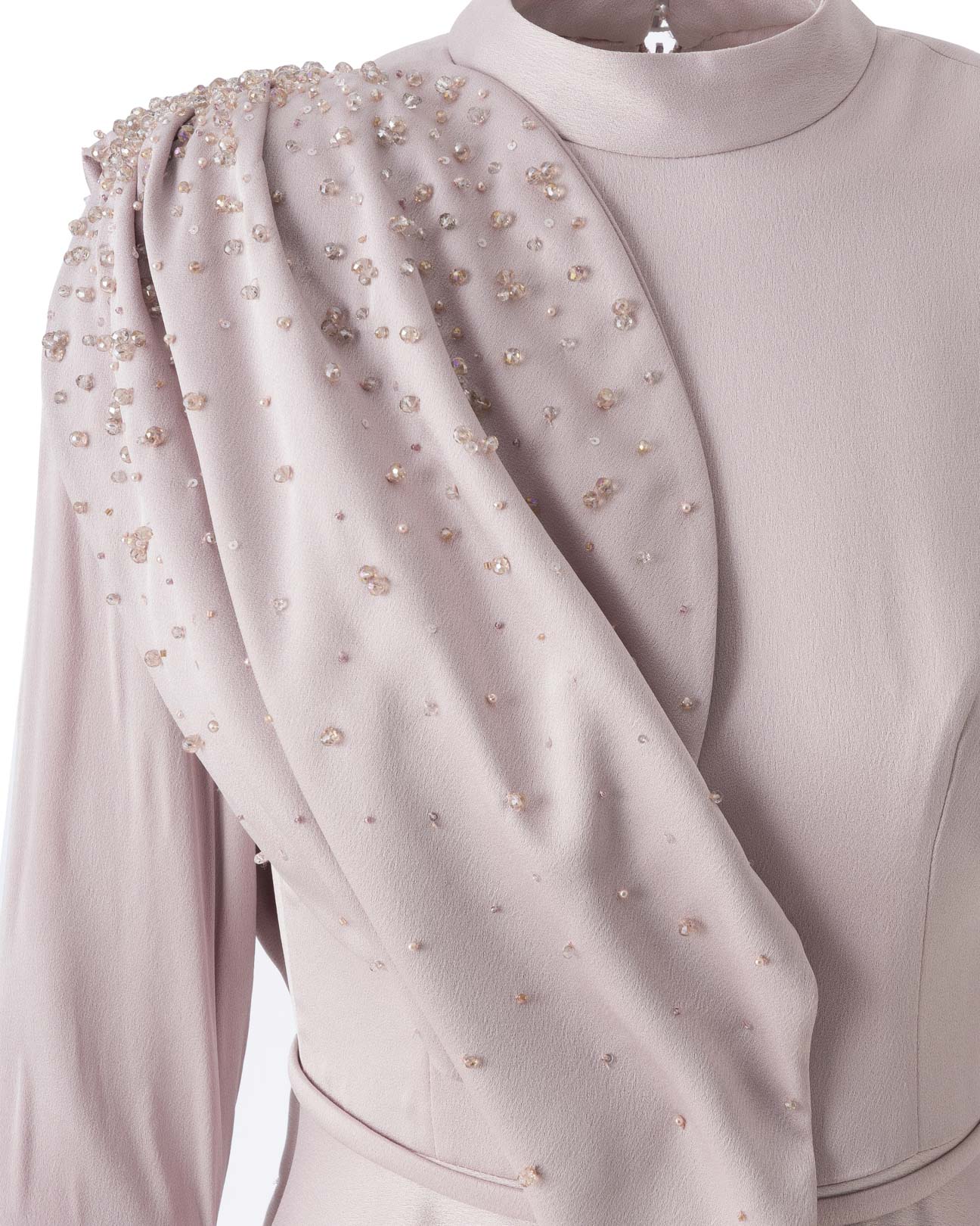 ÜRÜN ÖZELLİKLERİ: Hakim Yaka, Uzun Kollu, Apolet Drapeli ve Kristal İşleme Detaylı, Gizli Fermuarlı, Tamamı Astarlı, Uzun Kollu Gece Elbisesi