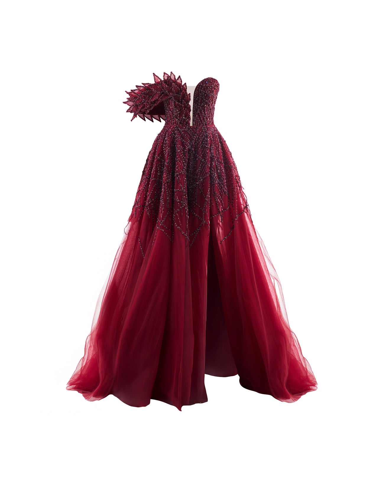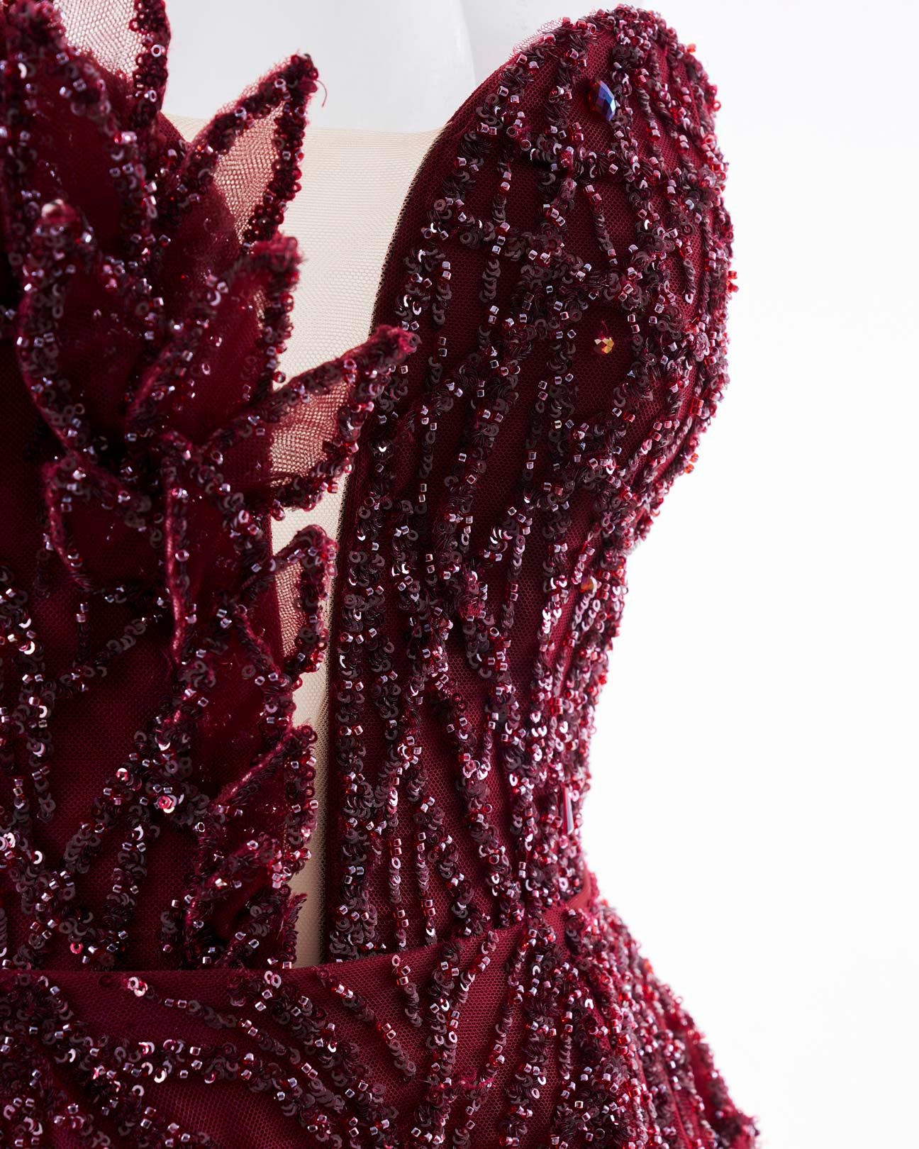 ÜRÜN ÖZELLİKLERİ: Straplez Yaka, El Yapımı Yaprak İşleme Detaylı, İp Bağlama Detaylı, Tamamı Astarlı, Bordo Mini Boy & Ek Etekli Gece Elbisesi