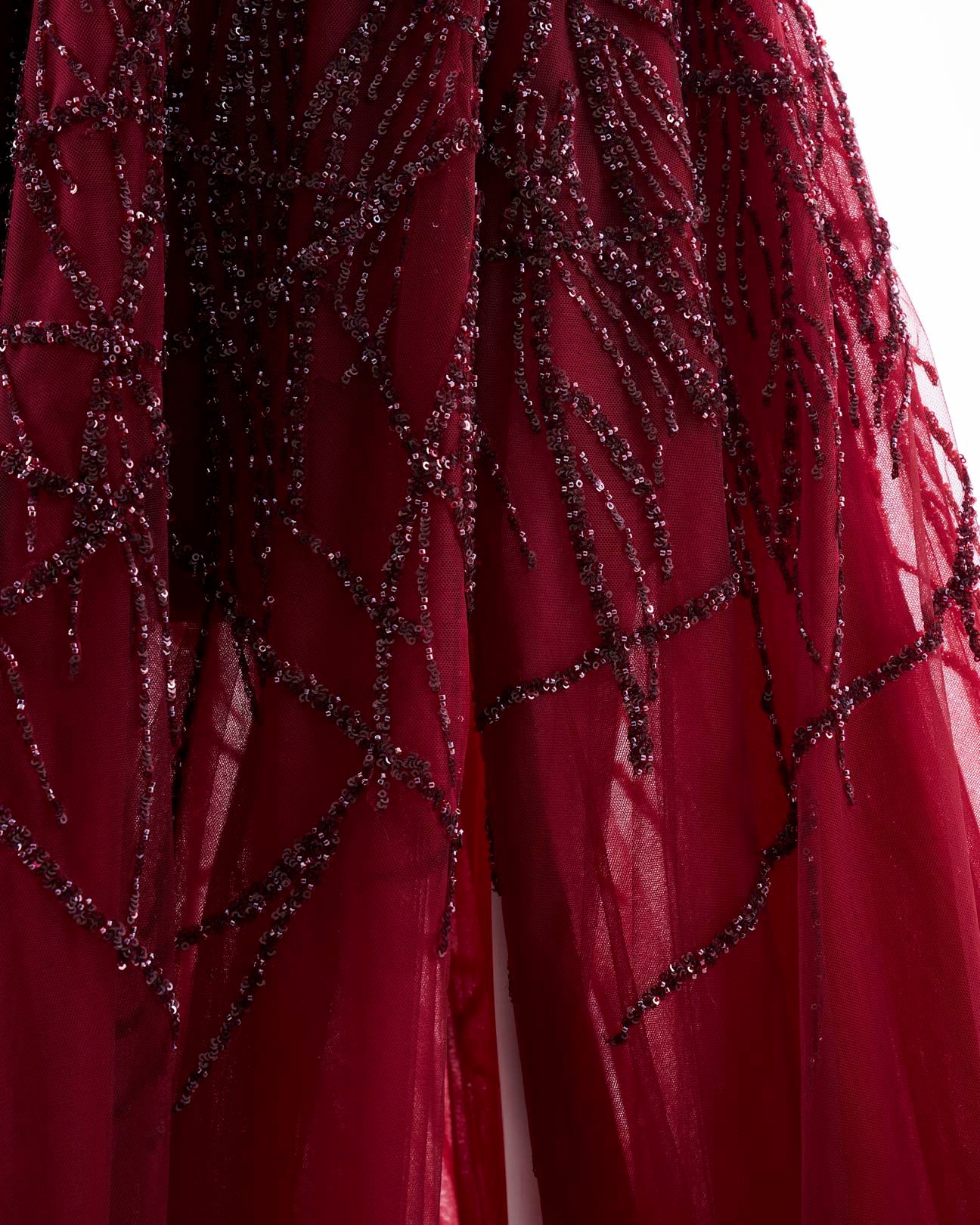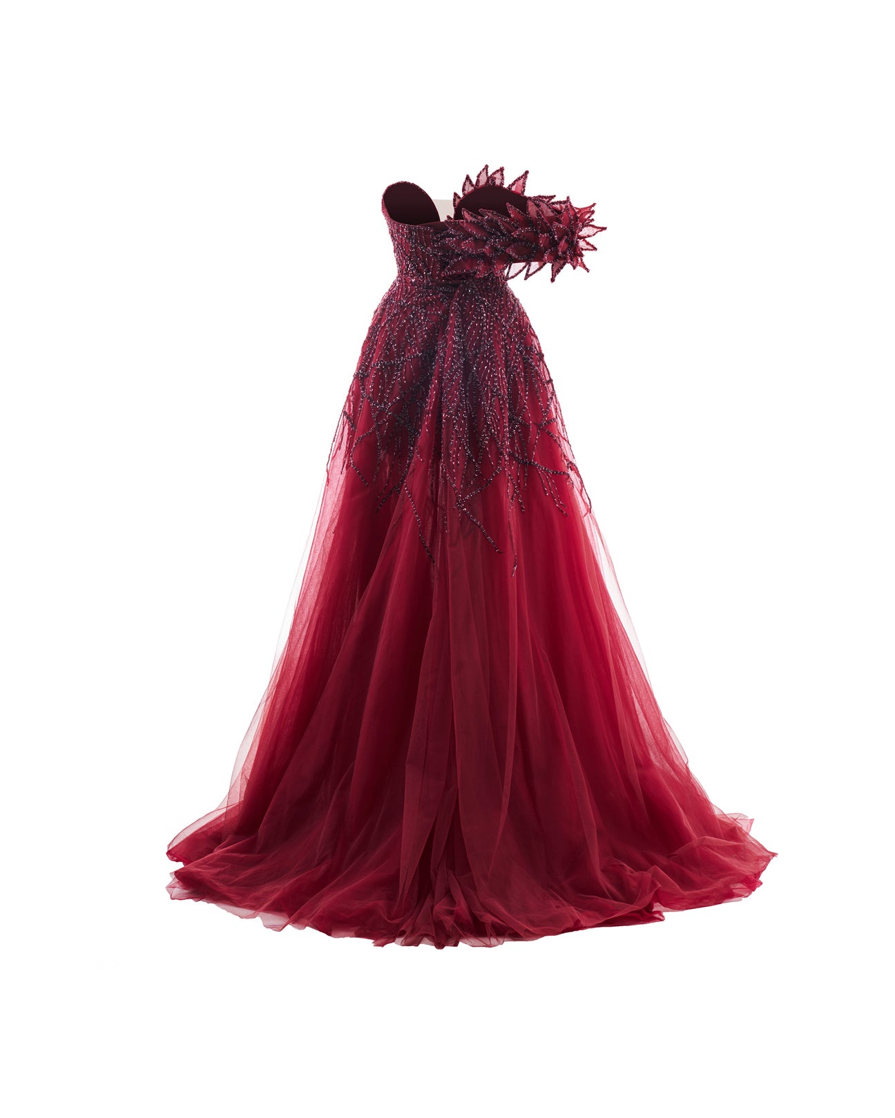 Tek Omuzlu El Yapımı Yaprak Tasarımlı Bordo Ek Etekli Elbise