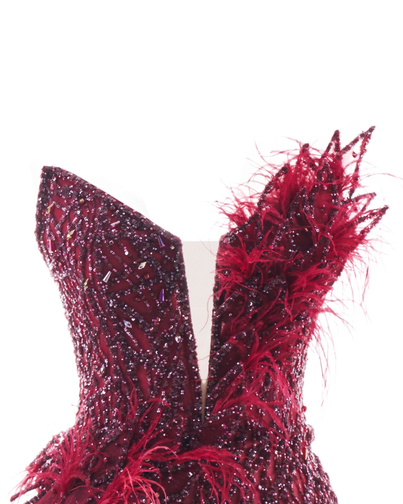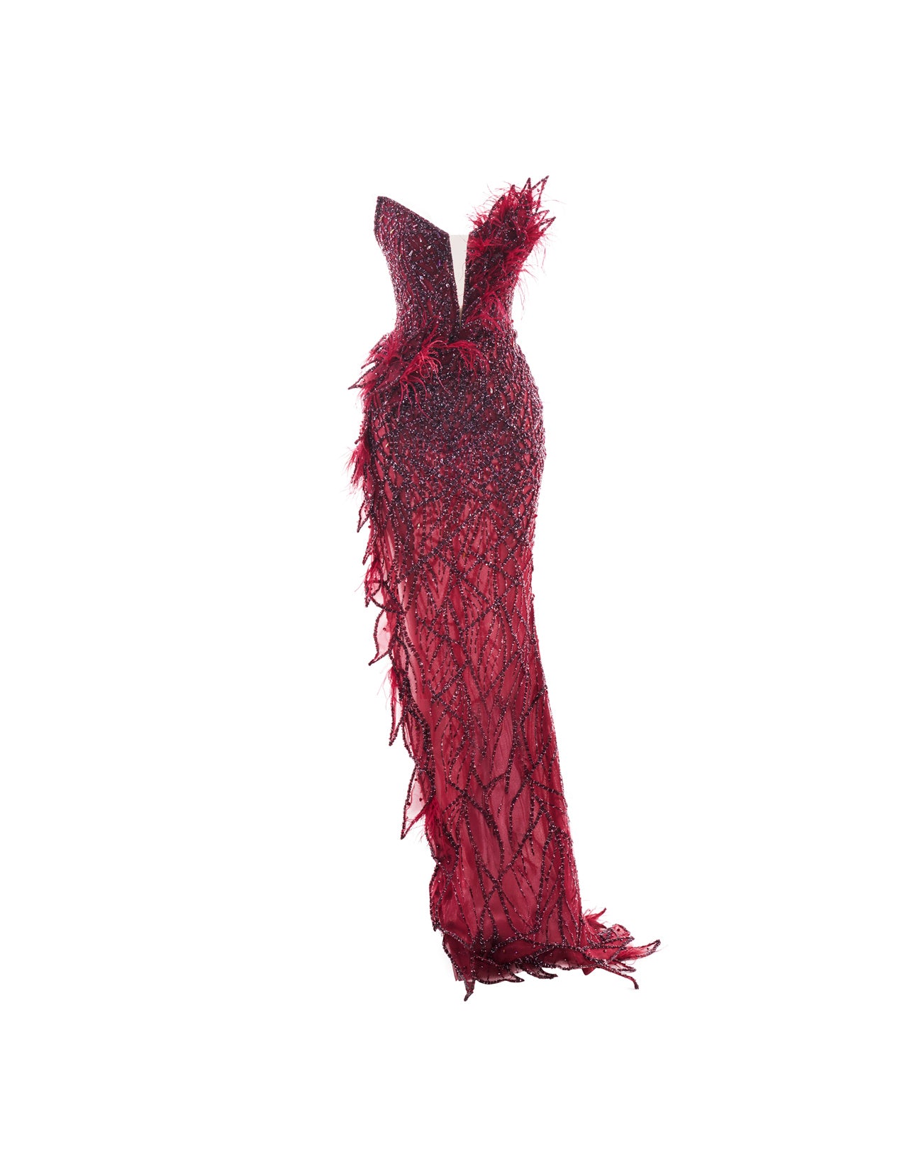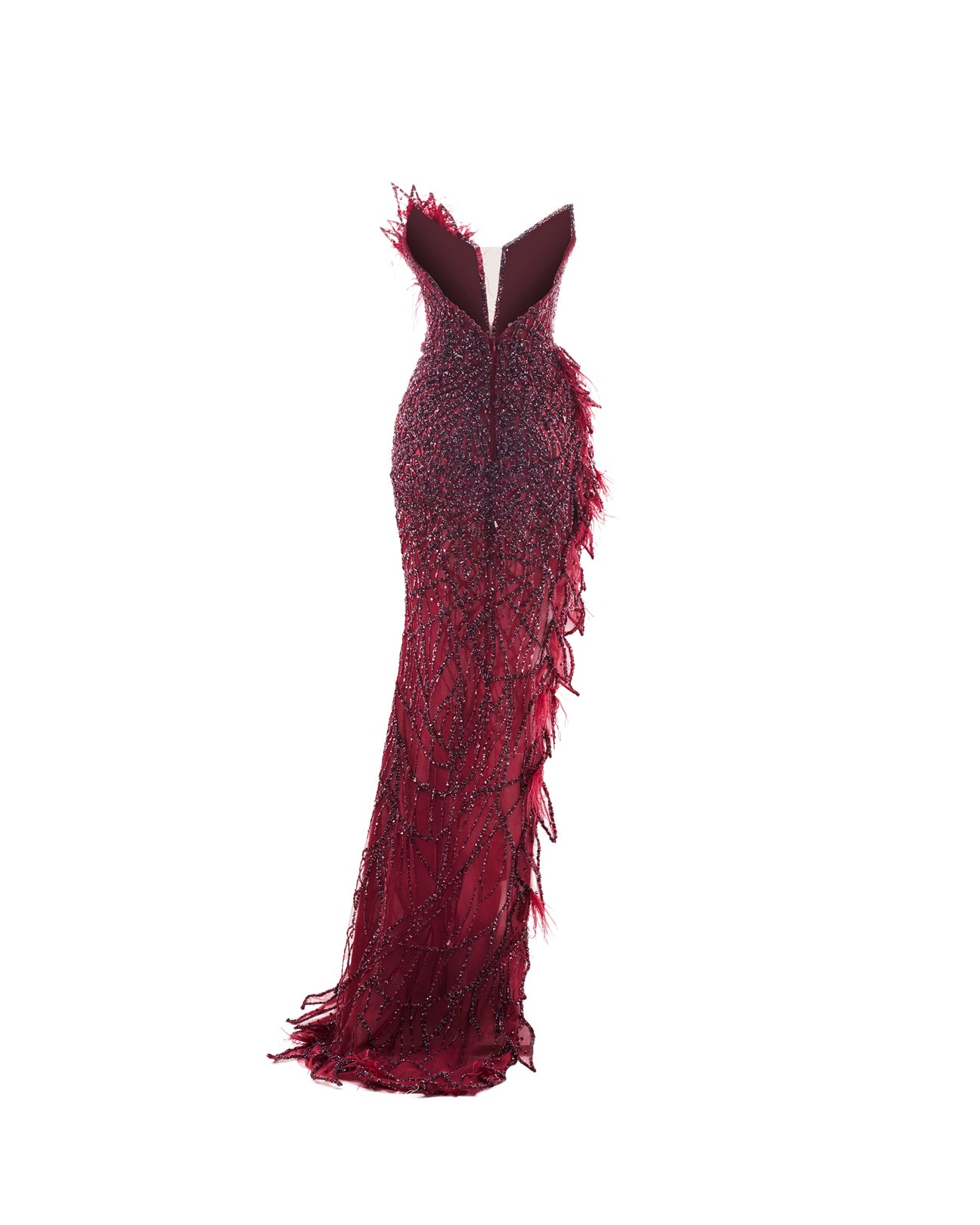 ÜRÜN ÖZELLİKLERİ: Straplez Yaka, El Yapımı Yaprak İşleme ve Otriş Detaylı, Tamamı Transparan, Yırtmaçlı, Bordo Gece Elbisesi