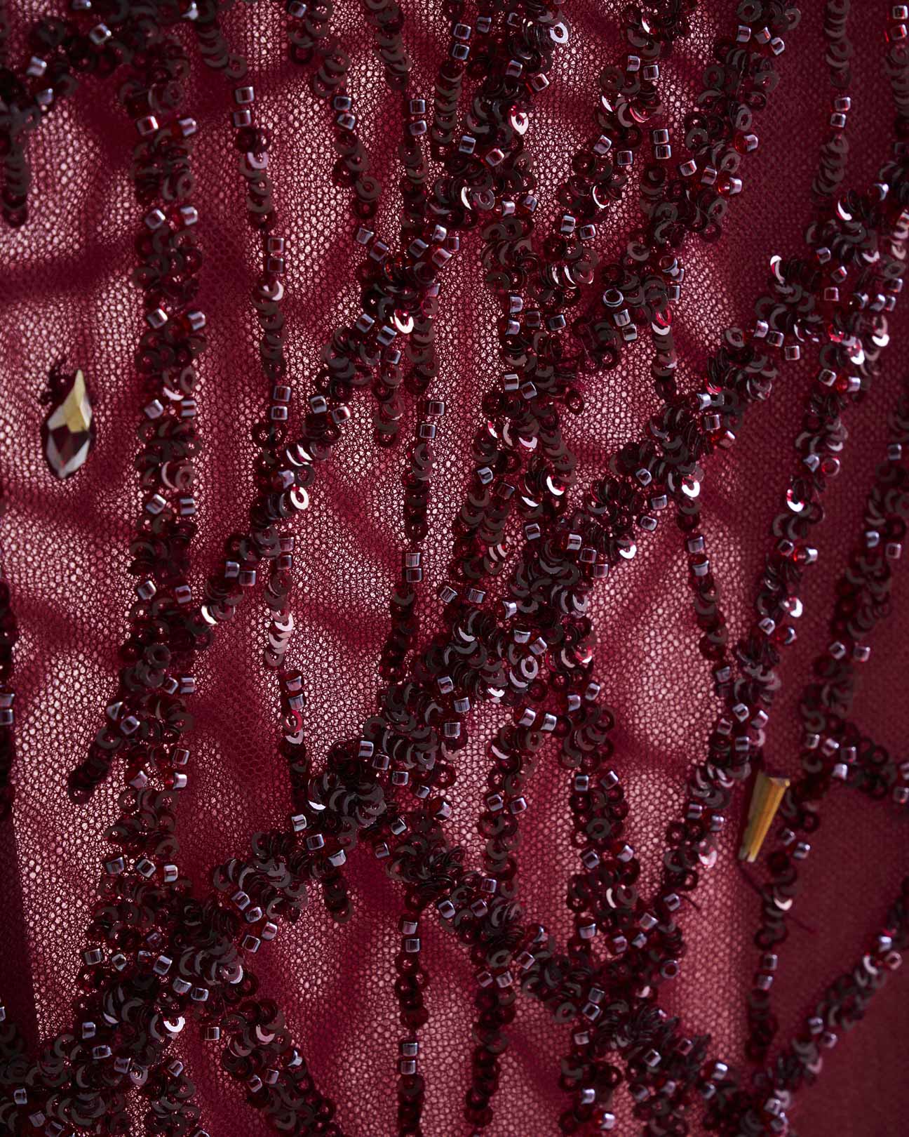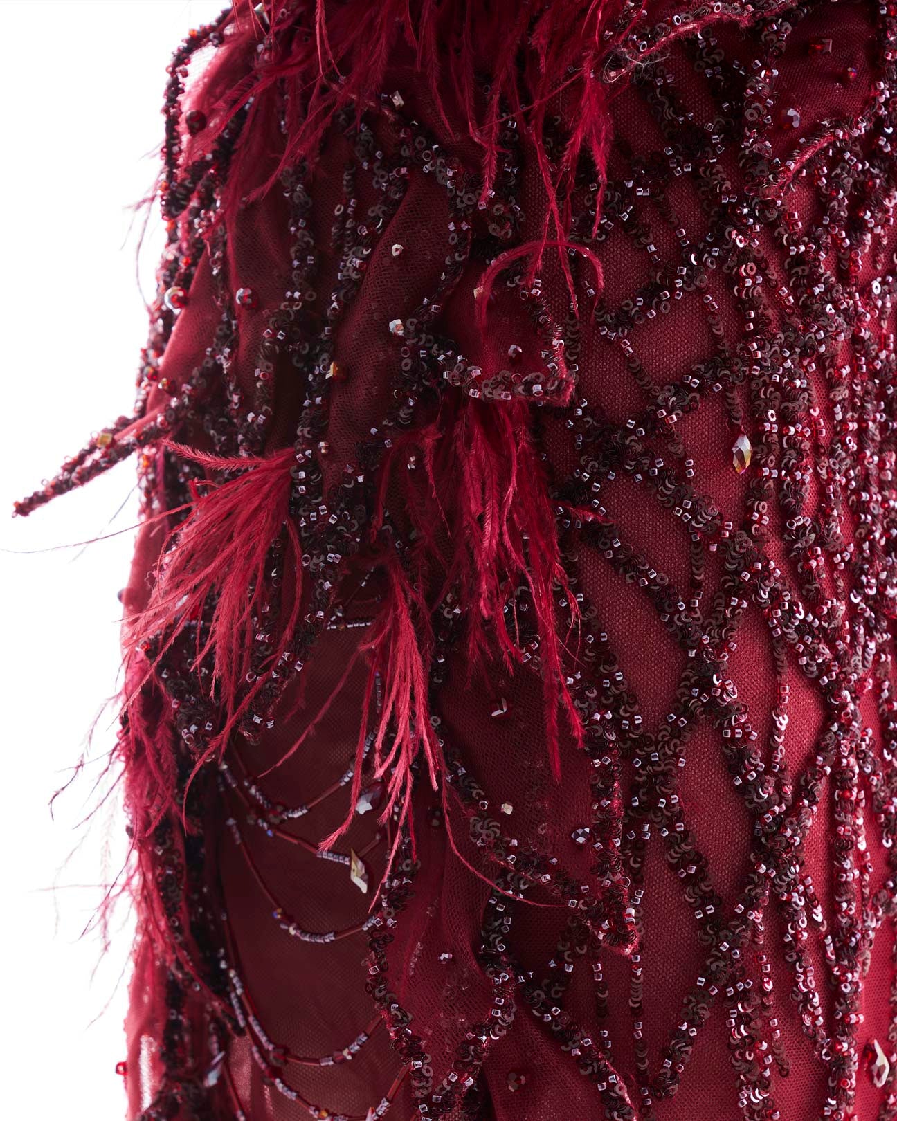 İşleme ve Yaprak Dökümü Tasarımlı Yırtmaçlı Otrişli Bordo Gece Elbisesi