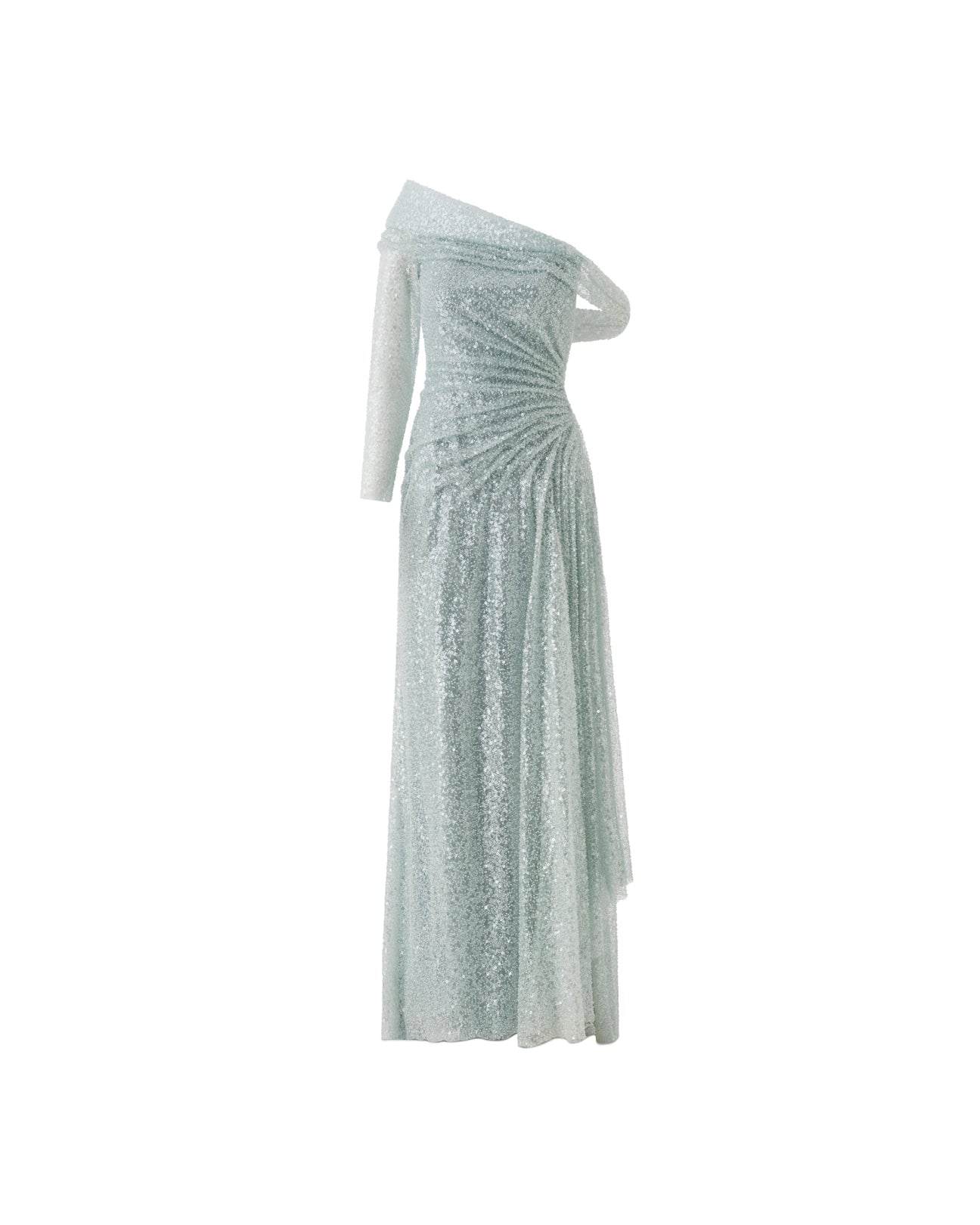 Asimetrik Yaka Tasarımlı Drapeli Sıvama Tek Kollu Gece Elbisesi