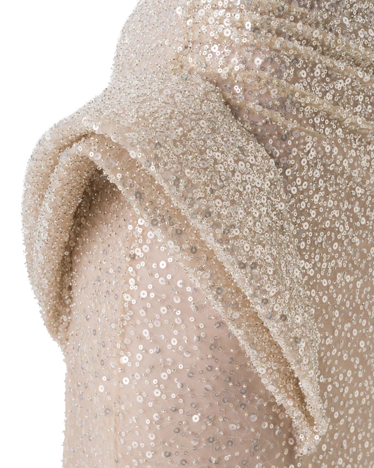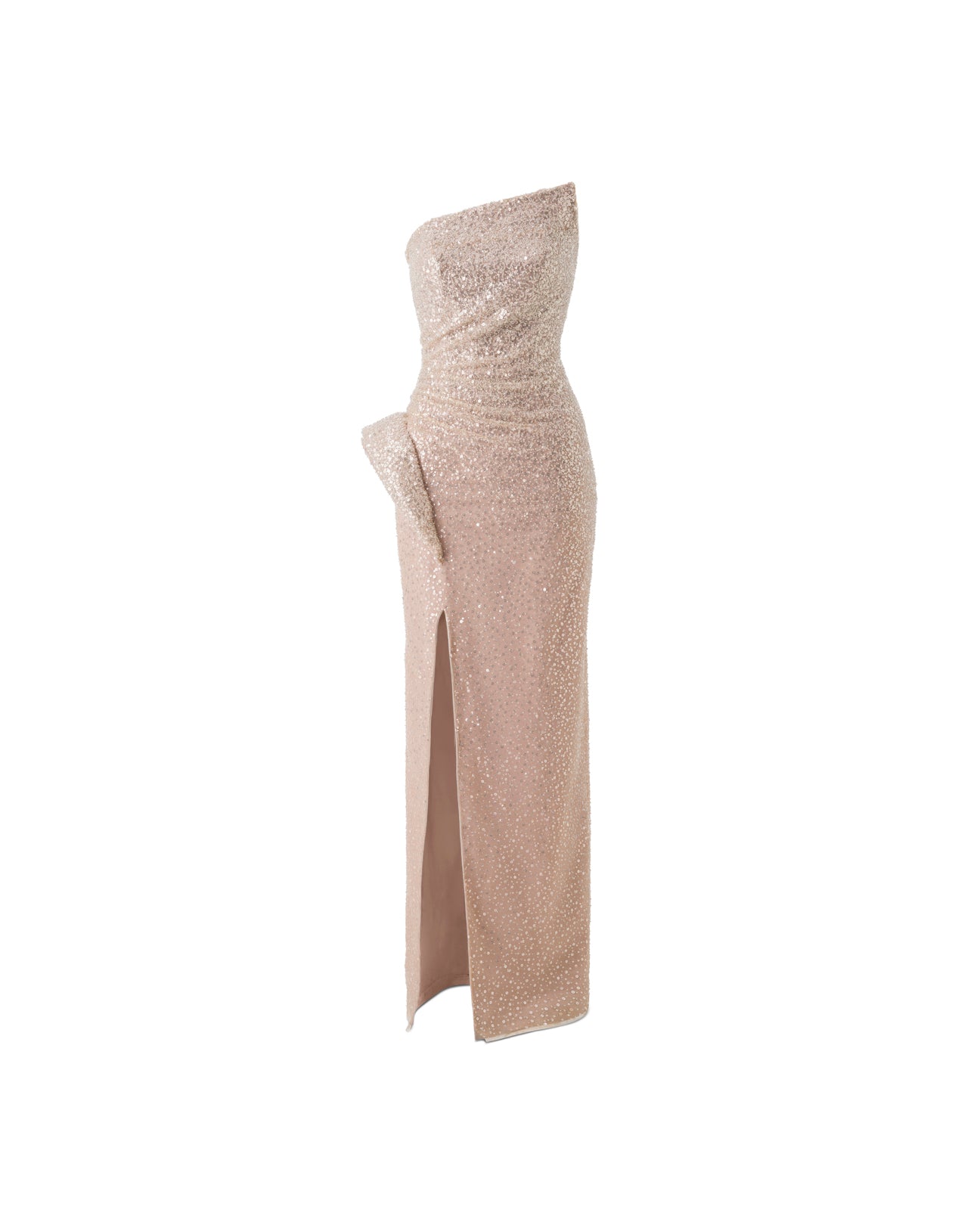 Asimetrik Straplez Yaka Yırtmaçlı Pullu Maxi Elbise
