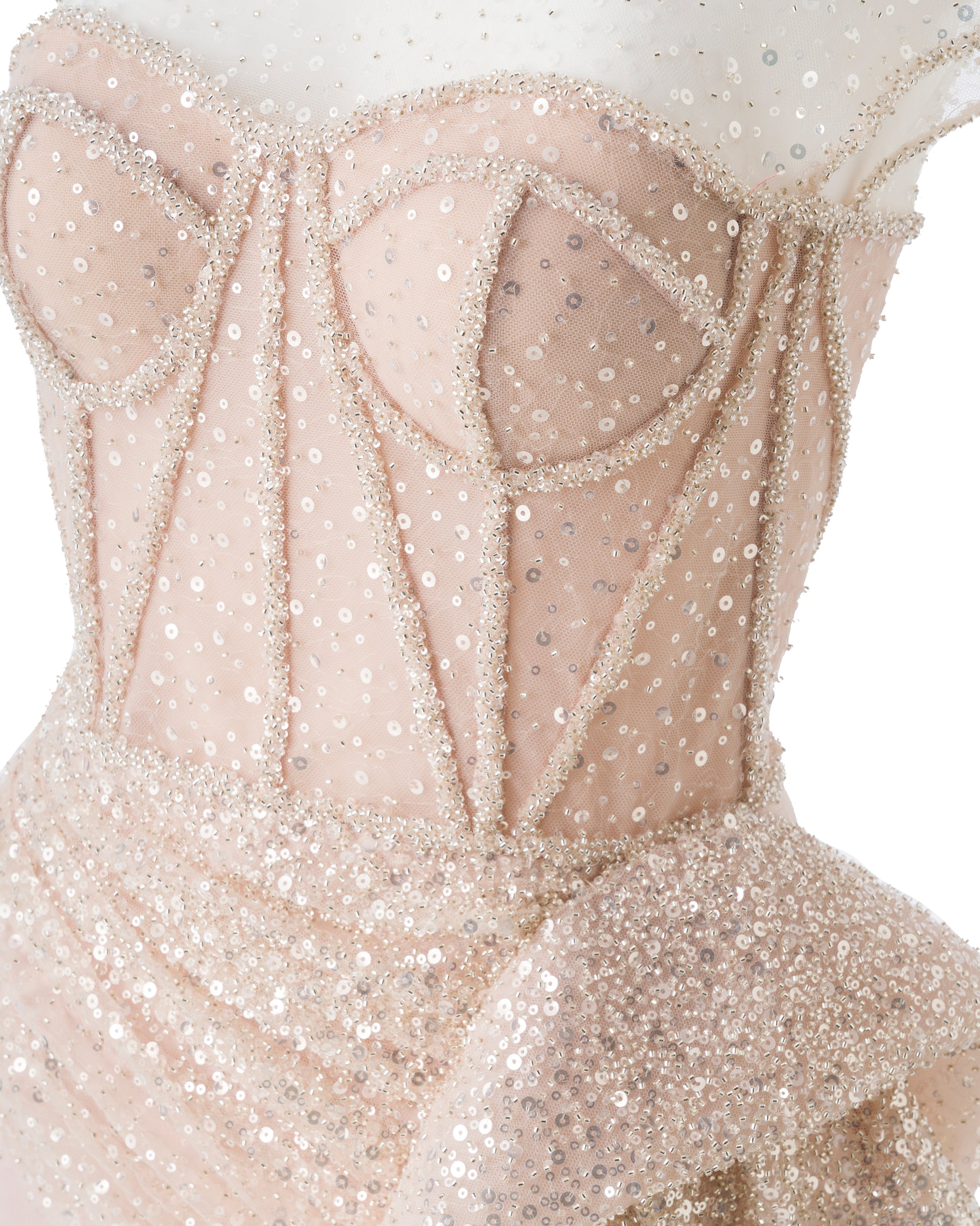 Bustiyerli, asimetrik drape detaylı, üst beden transpran, alt etek tamamı astarlı, el yapımı kristal taş işlemeri, ek eteklli balık kesim özel tasarım gece elbisesi.